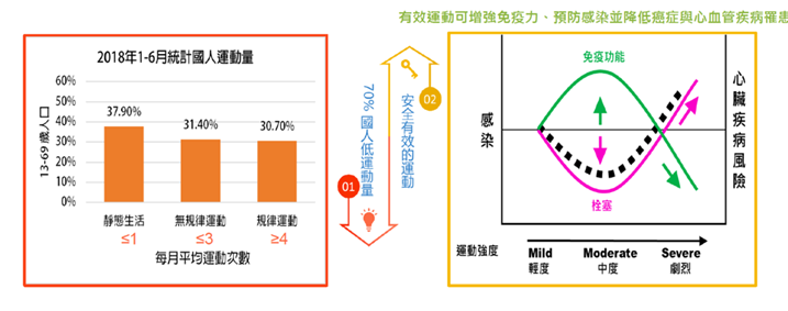 新冠疫情下如何防疫?疫情後的長新冠症候群(long-COVID)如何改善?研究證實,運動抗疫效果佳。提升免疫力能幫助我們對抗外界病原的侵襲,在世紀之疫Covid-19的威脅下更為重要。運動是提升免疫力的「最佳良藥」。根據臨床調查研究顯示,適度運動可以有效增強免疫力,預防感染風險以及降低癌症的發生率。然而,衛福部2018年1-6月的統計資料顯示,70%國人之運動量明顯不足(圖一)。雖然中等強度的運動能改善免疫及心血管功能,但劇烈運動反而會增加感染及心血管疾病的風險(圖二)。因此,如何強化國人的正確的運動習性,改善全民健康,是當前健康政策的重要課題。