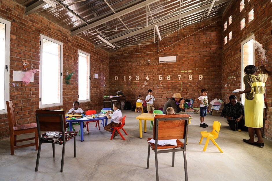 Kéré選擇在地人熟悉不過的「窮人材料」——黏土作為建材,為了避免被雨季大雨毀蝕,他創新建法,添加水泥提高土磚的防水性、補強棚頂與地基等防水設計,讓大家相信即便是黏土也能蓋出優質建築。此外,Kéré的家鄉雖然沒有幼稚園,社區之間仍具有強大凝聚力相互照顧,於是他匯聚大家一同參與小學的建造,加深彼此的信任感,也藉此過程創造出在地人都能理解、有共感的建築。
