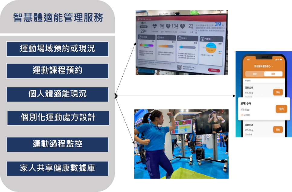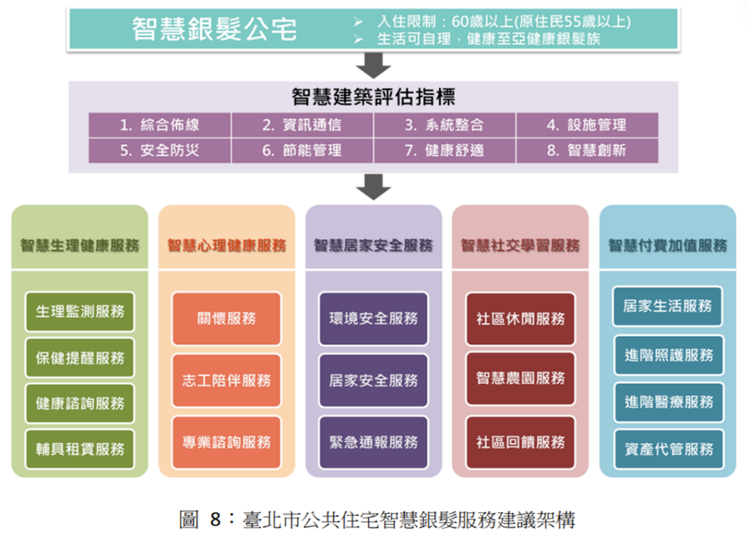 以「人」爲本的觀點發想,打造出人宅合一的場域。以智慧便民的資訊整合系統將各類的資訊數位化,有助於提升社區之間的交流,且能有效的收集居民的回饋和意見,活絡社區關懷氛圍。並且,善用科技的方式來協助了解居民的健康狀況,並推導適當的運動資訊於社區設施中,協助居民的養成和落實良好運動習慣。以下是為臺北市政府都發局所訂定的「臺北市公共住宅智慧社區建置參考手冊」的智慧銀髮服務之建議架構,並添加「體適能管理服務」作爲參考,也可適用於一般青銀共居之社區。